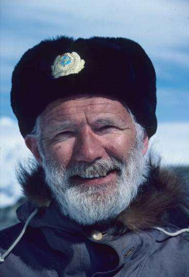 An older man with a white beard smiles outdoors in Antarctica, wearing a dark fur hat with an insignia and a coat with a fur collar. The snowy landscape and blue sky hint at Antarctic Logistics and Expeditions adventures.