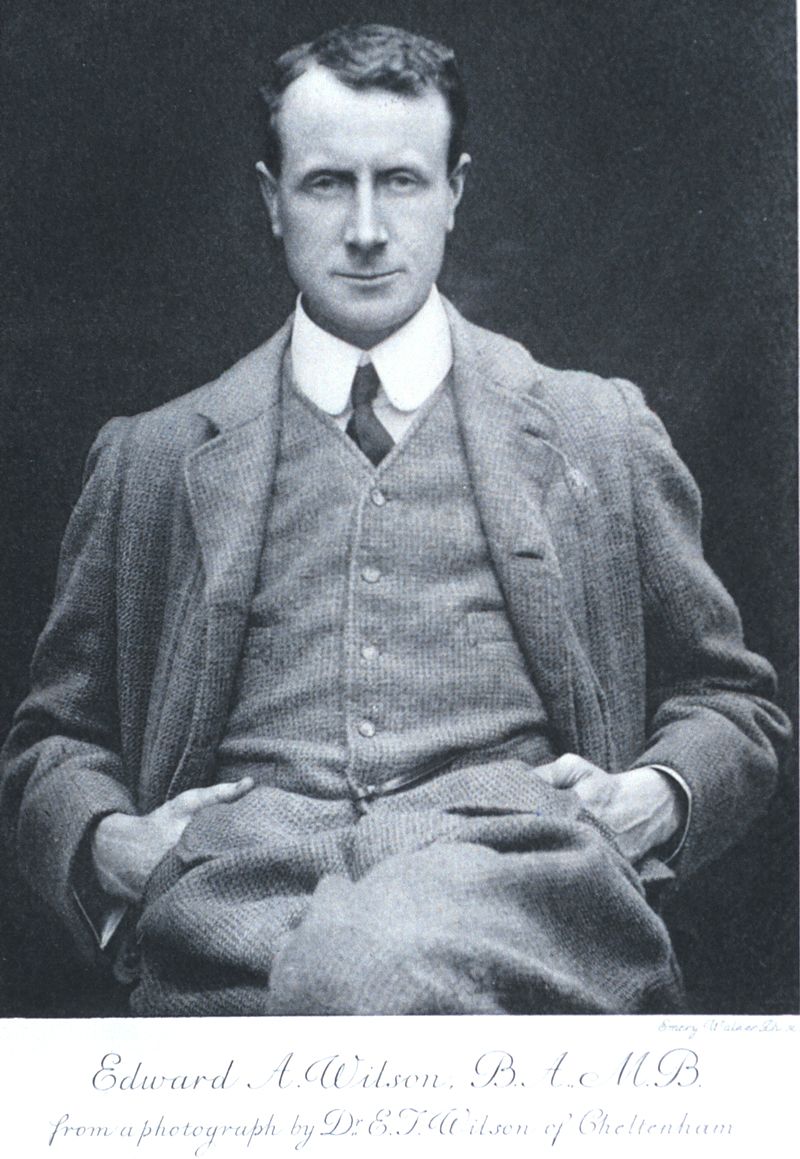 A black-and-white portrait of a seated man in a three-piece suit with a tie, looking directly at the camera. The text below identifies him as Edward A. Wilson, renowned for his pioneering work in Antarctica.