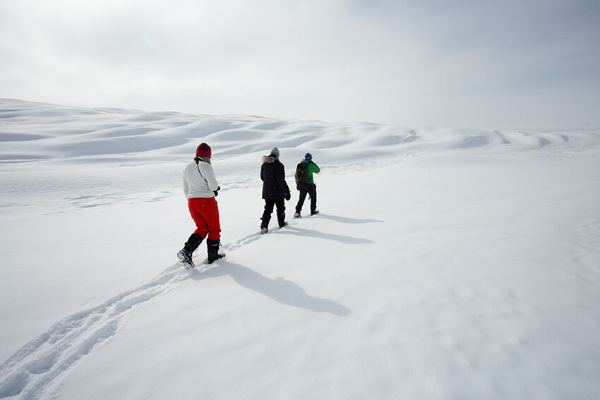 Three people dressed in winter clothing walk single file across a vast, snowy landscape near the South Pole, with gentle, rolling hills under a cloudy Antarctic sky.