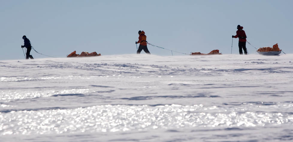 Three people trek across the snowy landscape of Antarctica, pulling sleds loaded with supplies behind them under a clear sky—a journey made possible with Antarctic Logistics and Expeditions. Their silhouettes stand out against the bright, snow-covered ground.