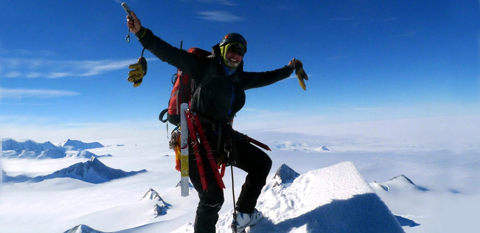 A climber wearing winter gear and sunglasses stands triumphantly on a snowy Antarctic peak with arms raised, surrounded by a panoramic view of Antarctica’s snow-covered summits under a clear blue sky—an epic moment with Antarctic Logistics and Expeditions.