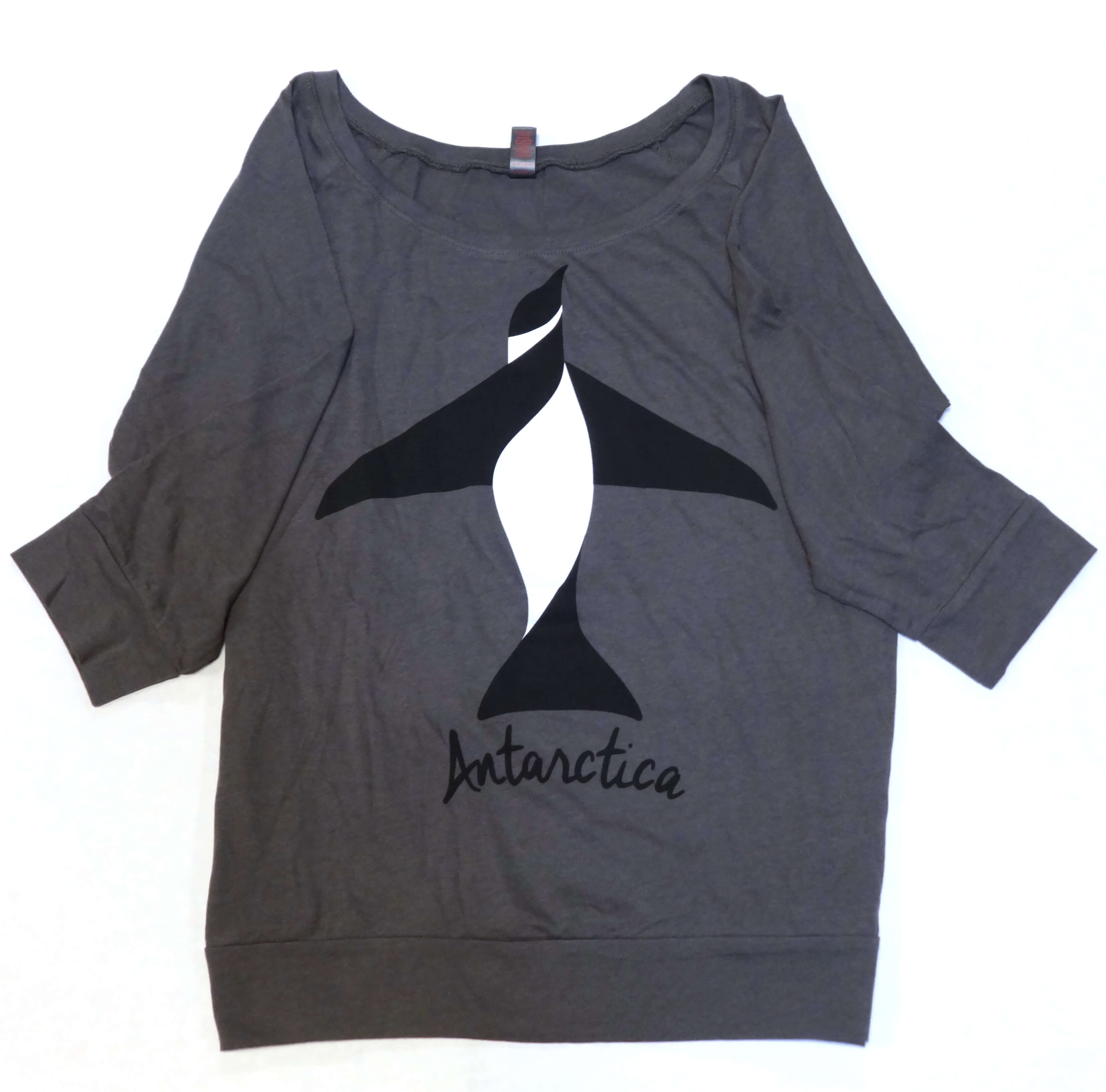 A dark gray shirt with three-quarter sleeves featuring a black and white abstract penguin design, the word Antarctica below the image, and a nod to South Pole adventures.