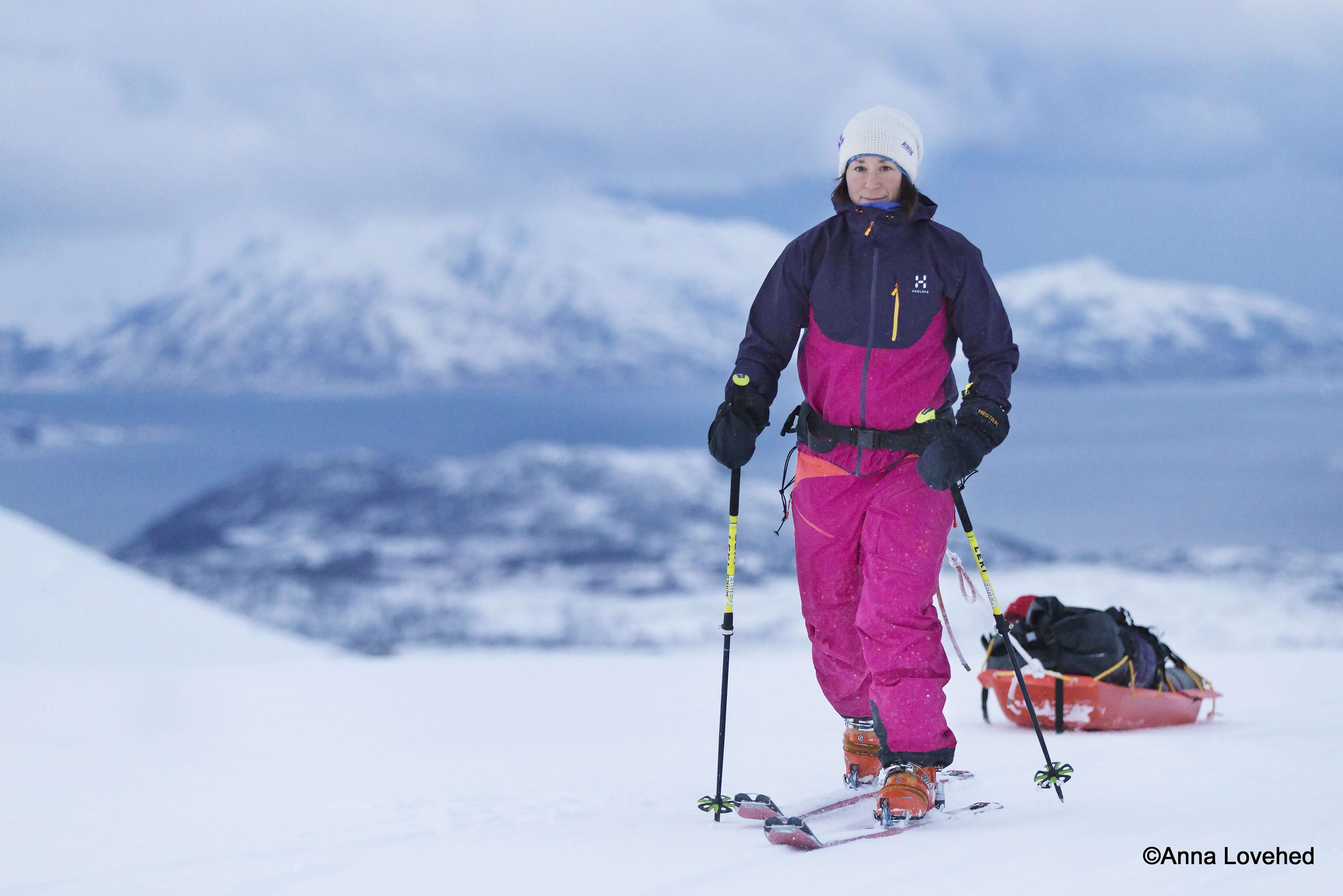 A person dressed in winter gear skis across a snowy Antarctic landscape, pulling a sled with supplies. Snow-covered mountains and a body of water are visible in the background under a cloudy sky near the South Pole.