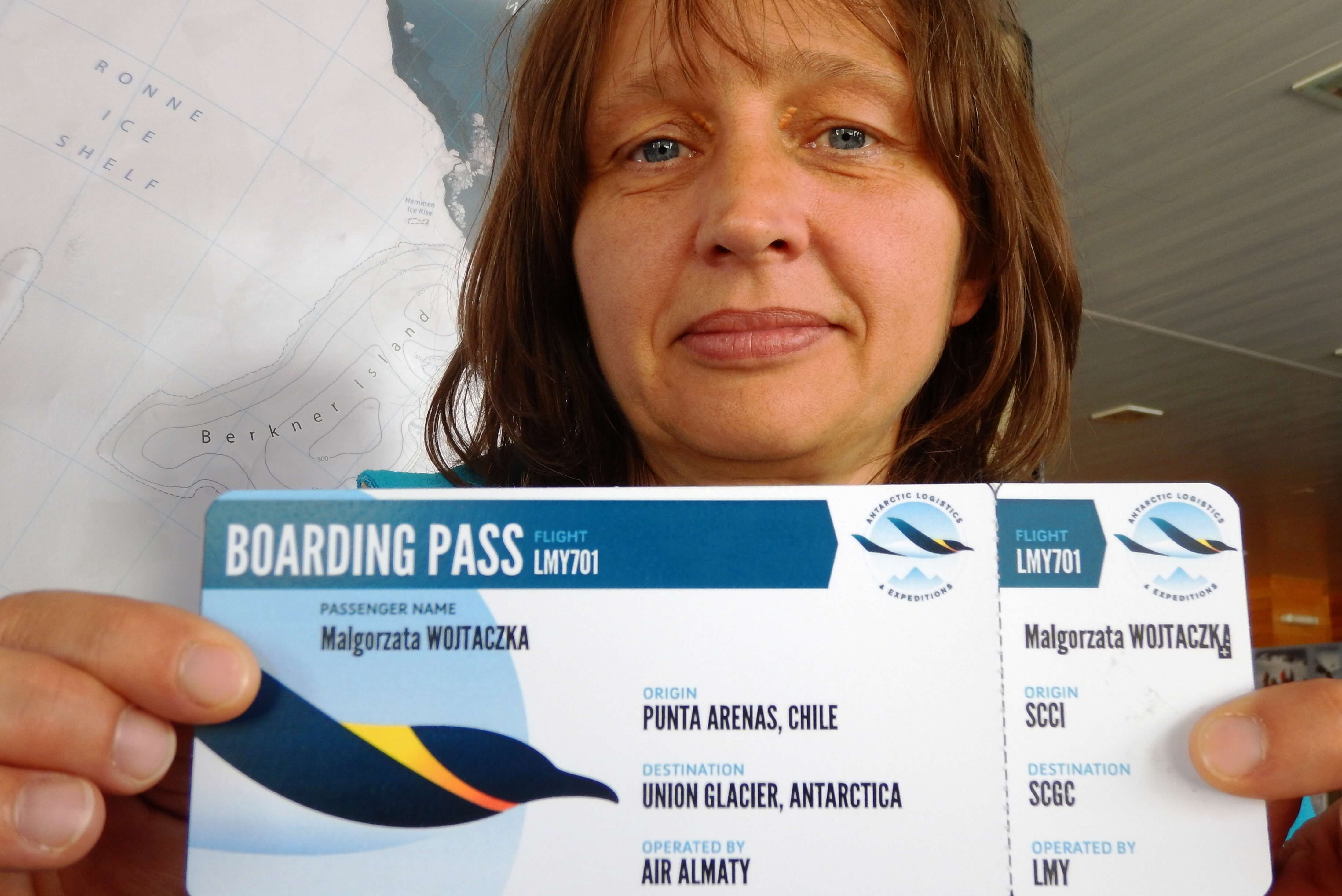 A woman holds up a boarding pass from Punta Arenas, Chile to Union Glacier, Antarctica with Antarctic Logistics and Expeditions. A map of Antarctica is visible behind her, and the pass shows her name as Malgorzata Wojtaczka.