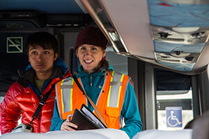Two people stand inside an Antarctic Logistics and Expeditions bus; one wears a reflective safety vest and holds a clipboard while the other wears a red jacket. A wheelchair accessibility sign is visible behind them near the South Pole.