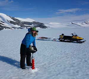 A person in a blue jacket and green hat drills into ice on a snowy Antarctic landscape, with a snowmobile and sled in the background, surrounded by mountains under a blue sky during an Antarctic Logistics and Expeditions journey.