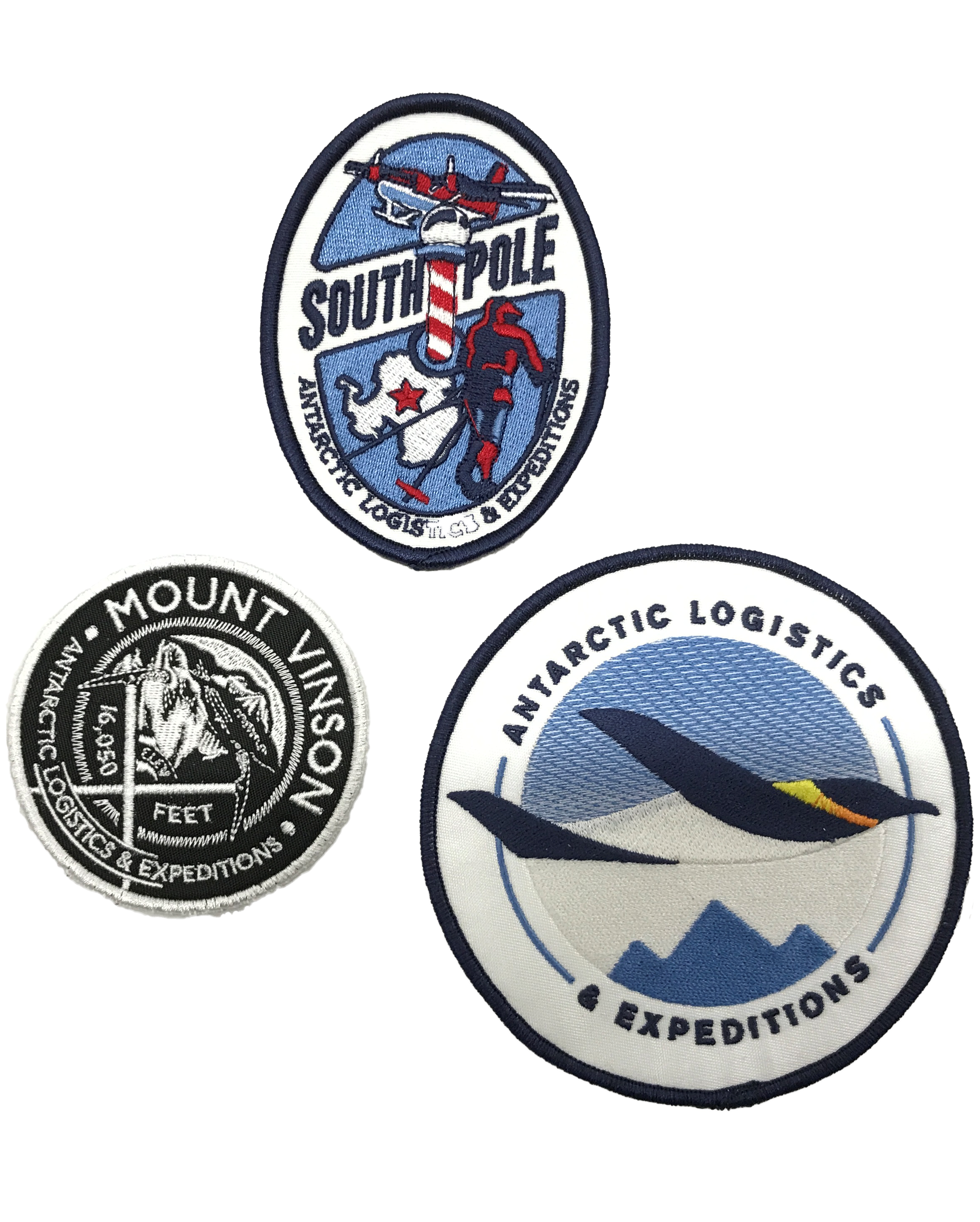 Three embroidered patches: one featuring the South Pole and a plane, one with Mount Vinson and a mountain image, and one with a stylized mountain and Antarctic Logistics & Expeditions around the border—all inspired by Antarctica.