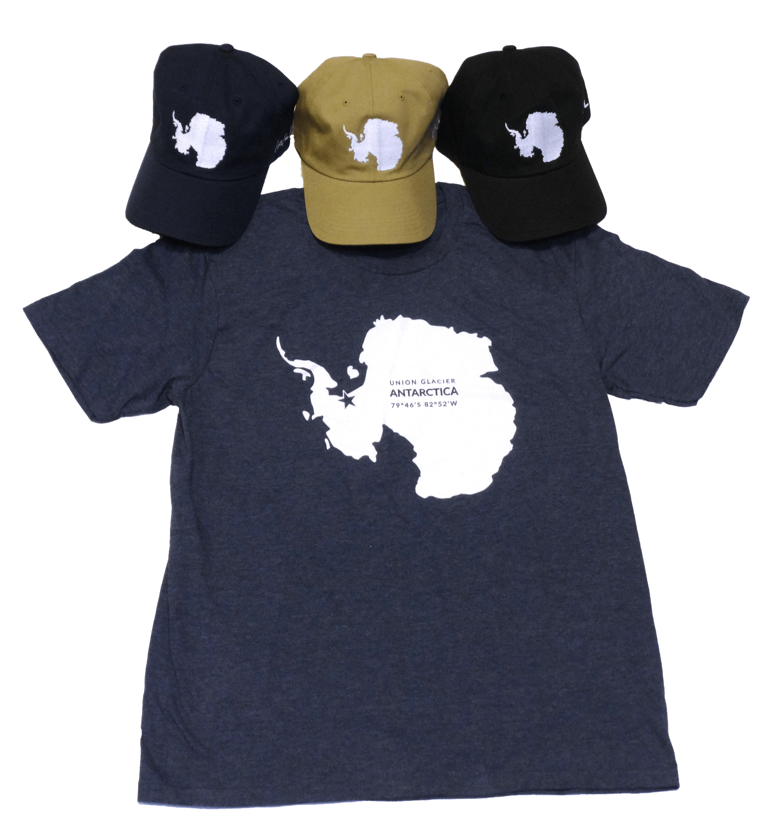A navy blue T-shirt with a white map of Antarctica and three baseball caps—black, olive green, and navy—each featuring a white Antarctica outline above the shirt. Show your love for Antarctic Logistics and Expeditions in style.
