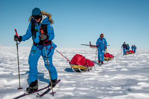 Four people in blue cold-weather gear ski across a snowy Antarctic landscape, each pulling a sled loaded with red bags under a clear blue sky—a scene reminiscent of Antarctic Logistics and Expeditions journeys to the South Pole.