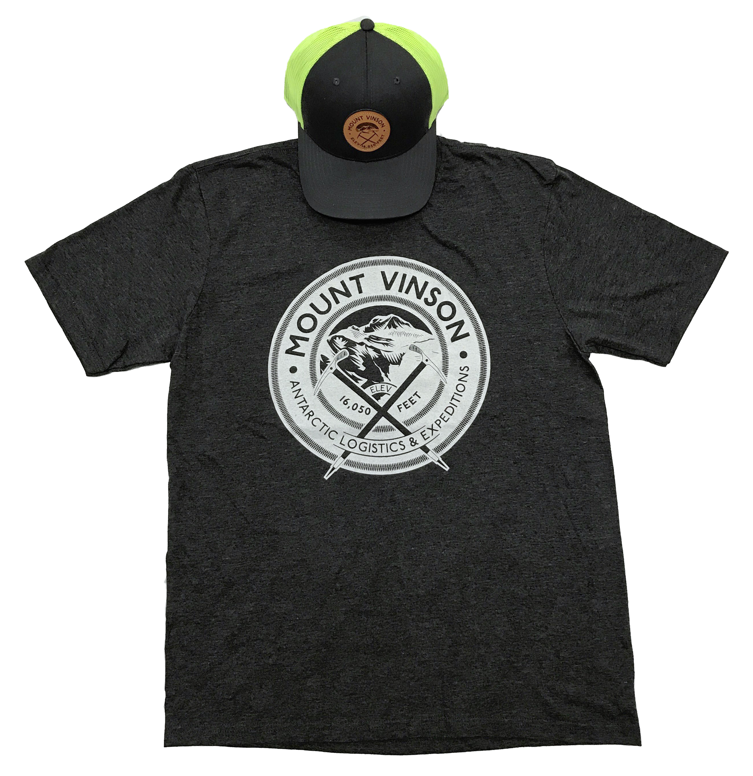 A dark gray t-shirt with a Mount Vinson graphic and crossed ice axes—perfect for Antarctica enthusiasts—paired with a black and neon green baseball cap featuring a brown circular patch on the front.