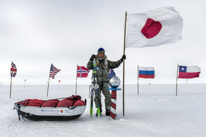 A person in cold-weather gear stands on snow at the South Pole, holding a ski pole and a large Japanese flag. Several other national flags and a sled loaded with gear, common in Antarctic Logistics and Expeditions, are nearby under an overcast sky.