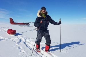 A person dressed in cold-weather gear stands on snowy terrain with ski poles, pulling a red sled near a small red plane parked under the clear blue sky—an adventurous scene from an Antarctic Logistics and Expeditions journey in Antarctica.