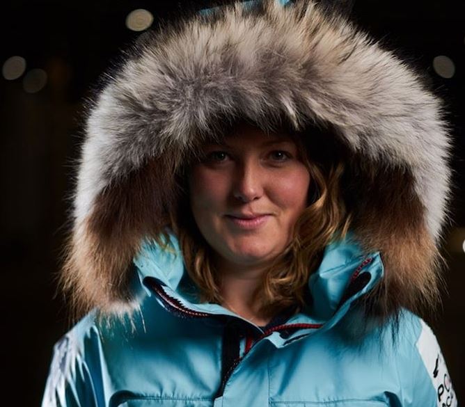 A person wearing a teal parka with a large, fluffy fur-lined hood, smiling slightly and standing against a dark background—ready for an Antarctic Logistics and Expeditions adventure in Antarctica.