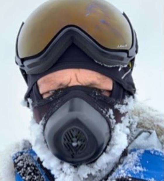 Person wearing a ski mask, large goggles, and a respirator-style mask with ice and frost on their gear, evoking the extreme cold of Antarctica or a South Pole expedition.