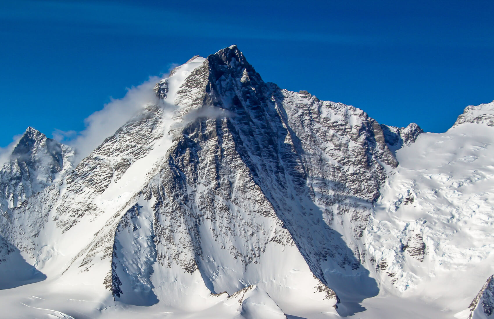 A tall, snow-covered mountain peak in Antarctica rises sharply against a clear blue sky, with wisps of clouds drifting around its summit—an iconic scene for Antarctic Logistics and Expeditions en route to the South Pole.