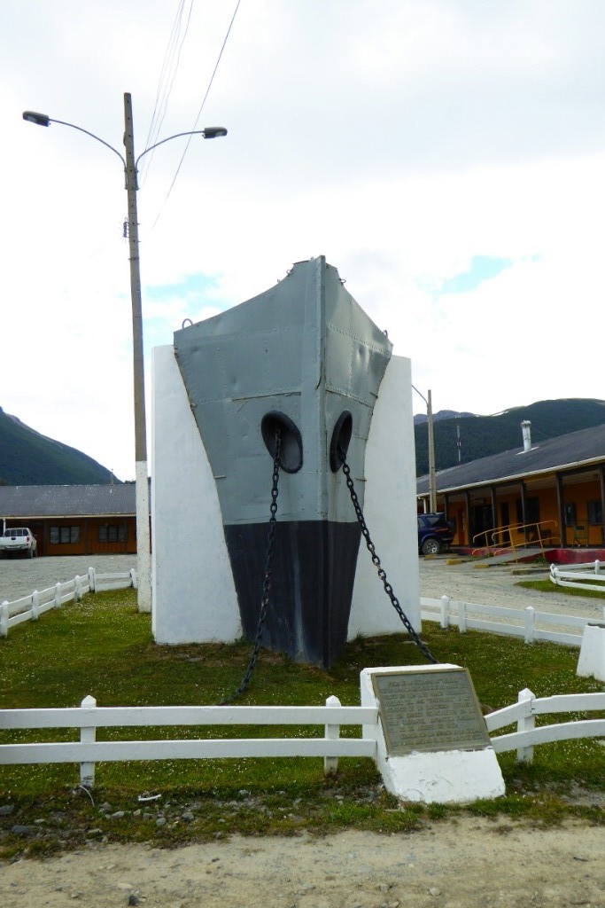 A large ship’s bow with two anchor chains, reminiscent of Antarctic Logistics and Expeditions vessels, is mounted upright on a concrete base, surrounded by white fences. A plaque stands in front, with mountains and buildings visible in the background.