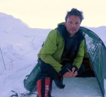 A person in a green jacket and red gaiters kneels outside a small green tent, surrounded by snow in the icy environment of Antarctica, likely preparing for an adventure with Antarctic Logistics and Expeditions.