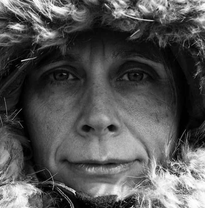 Close-up black-and-white photo of a person wearing a hood with thick, fluffy fur trim, gazing directly at the camera with a neutral expression—capturing the spirit of Antarctic Logistics and Expeditions at the edge of Antarctica.