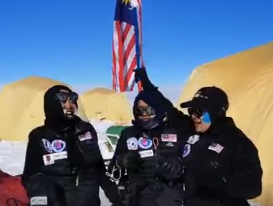 Three people in winter gear are smiling and holding a Malaysian flag in snowy Antarctica, with yellow tents in the background under a clear blue sky.