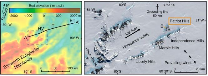 Two maps of the Ellsworth Subglacial Highlands, Antarctica: left shows bed elevation in colors; right is a satellite image with glaciers, valleys, hills, and labeled sites like Patriot Hills and Union Glacier—key areas for Antarctic Logistics and Expeditions.