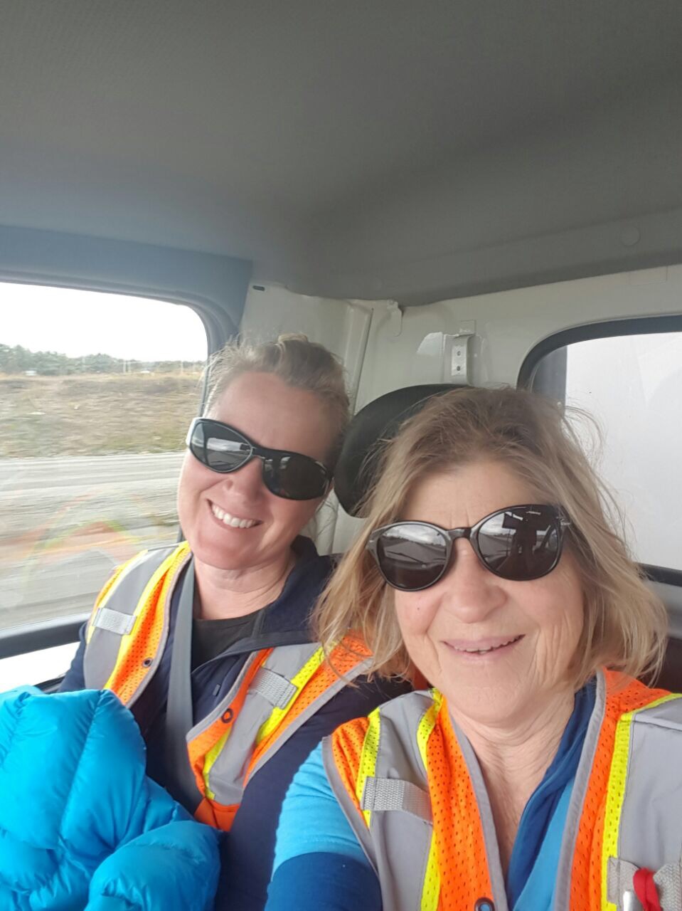 Two women wearing reflective safety vests and sunglasses smile while sitting inside an Antarctic Logistics and Expeditions vehicle. One holds a blue jacket. The background shows a blurred Antarctica landscape seen through the window.