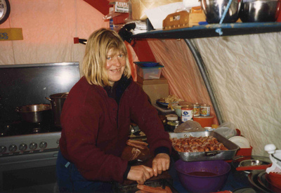 Sue S. prepares sausage rolls in the Patriot Hills kitchen. 1995