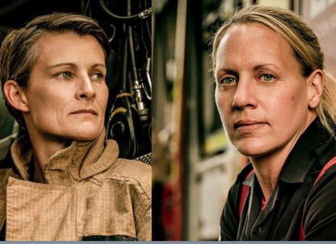 Two women with short hair, both wearing work uniforms, gaze seriously into the distance. The background suggests a professional environment, possibly Antarctic Logistics and Expeditions in Antarctica.