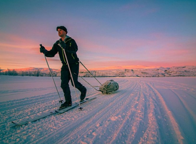 A person cross-country skiing on snowy terrain at sunset, pulling a sled behind them—much like an Antarctic Logistics and Expeditions journey. Snow-covered mountains and a colorful sky are visible in the background.