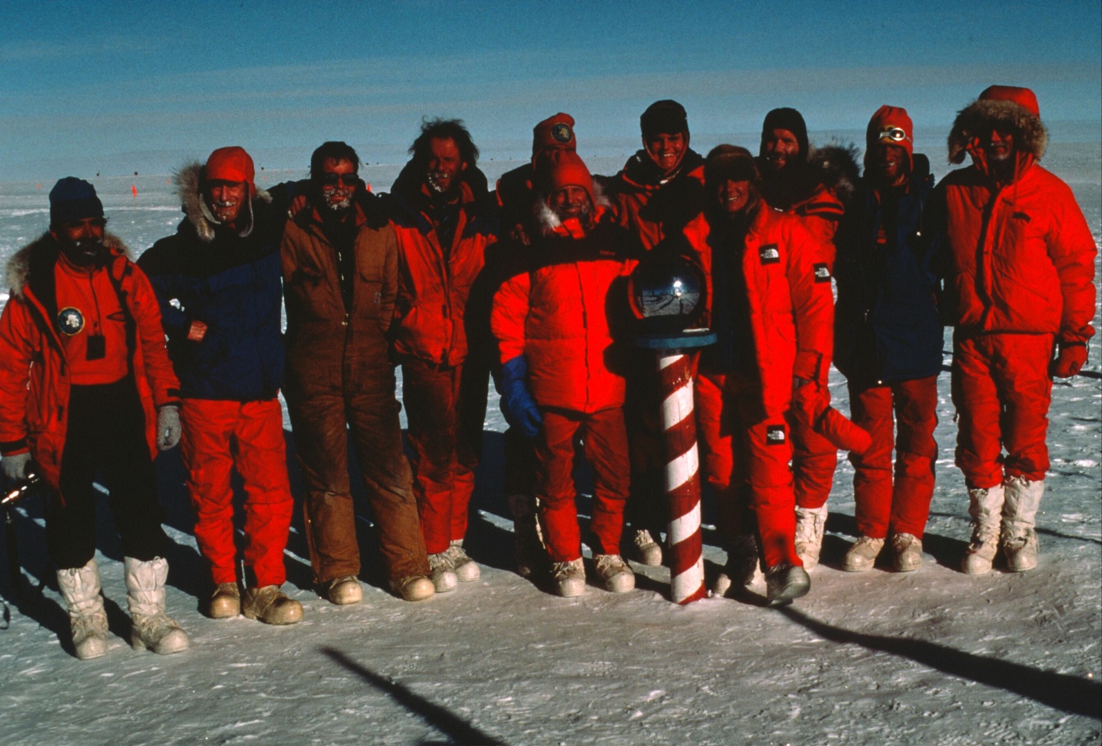 A group of people in red and blue cold-weather gear stand on a snowy landscape at the South Pole, smiling and huddled together near a striped pole topped with a reflective sphere, under a clear blue sky.