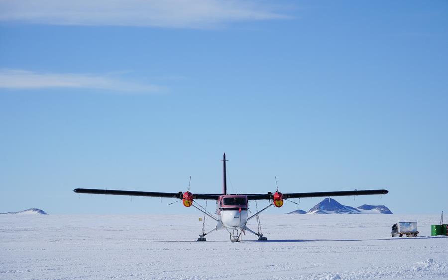 A small twin-propeller airplane operated by Antarctic Logistics and Expeditions is parked on a snowy, flat landscape in Antarctica under a clear blue sky, with distant snow-covered hills and a few objects visible in the background.
