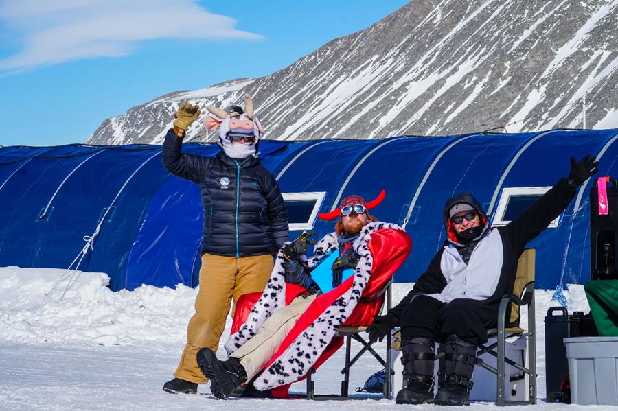 Three people in fun costumes—including a cow hat, red horned helmet, and penguin suit—pose and wave on snow in front of a blue tent and snowy mountains under a blue sky at an Antarctic Logistics and Expeditions camp near the South Pole.