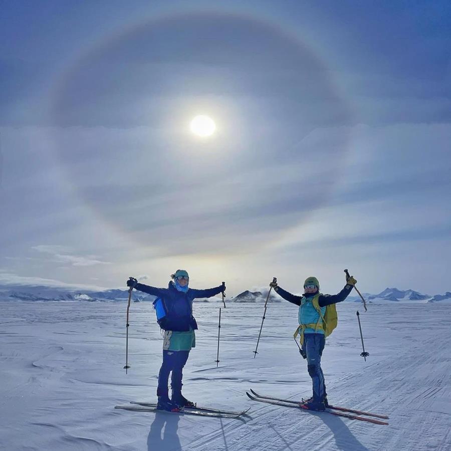 Two people on skis stand on snowy ground with arms raised, ski poles in hand. The sun shines brightly overhead, creating a halo in the blue sky. Snow-covered mountains rise behind them on an Antarctic Logistics and Expeditions journey.