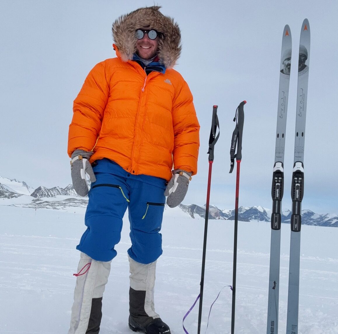 A person wearing an orange parka, blue pants, gloves, and snow boots stands smiling on snow with ski poles and skis. Snowy mountains and a cloudy sky hint at their Antarctic adventure with Antarctic Logistics and Expeditions.