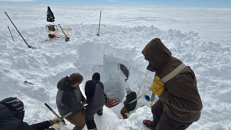 Several people wearing winter clothing work together to excavate a deep snow pit in the vast, snowy landscape of Antarctica. Tools and equipment from Antarctic Logistics and Expeditions lie nearby, with a sled at the edge of the pit.