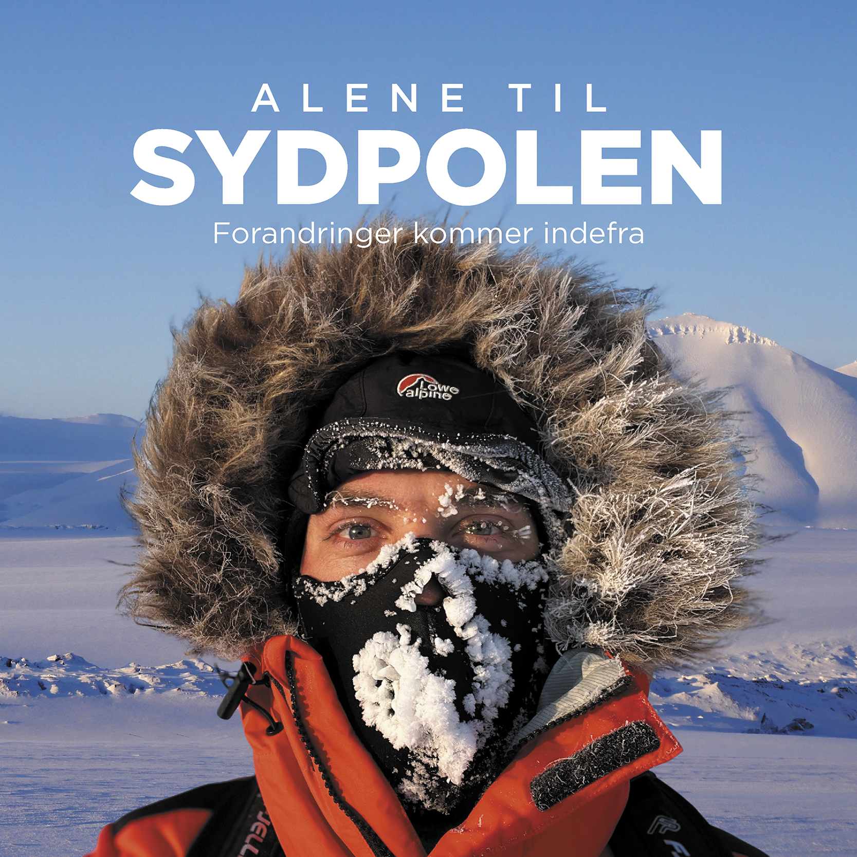 A person dressed in heavy winter gear with a frost-covered fur hood and face mask stands in a snowy, mountainous Antarctica landscape. Large text above reads ALENE TIL SYDPOLEN Forandringer kommer indefra.