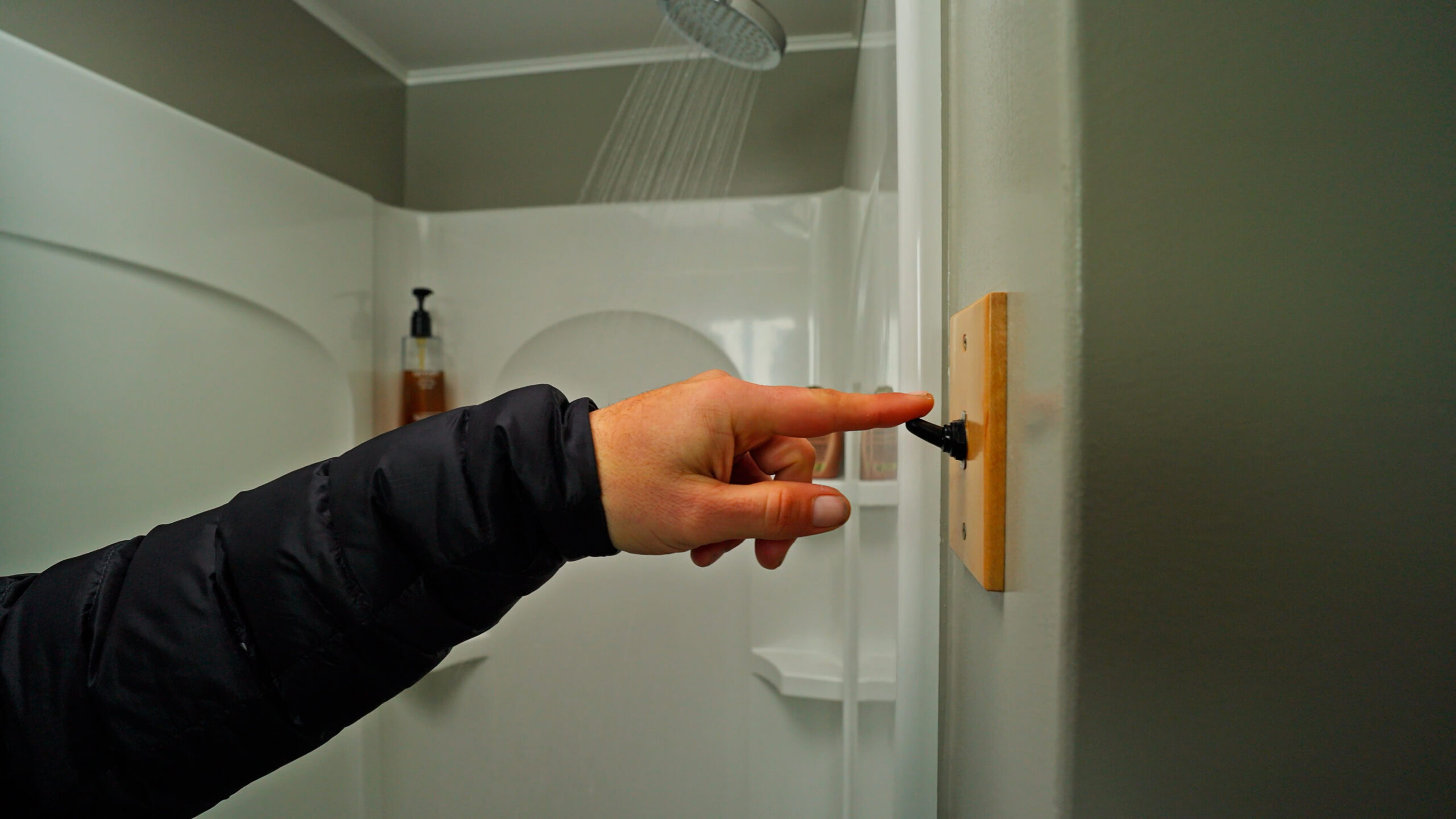 A person wearing a dark jacket presses a black switch on a beige wall near a shower, with water running from the showerhead in the background.