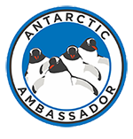 A circular badge with three penguins in the center on a blue background, surrounded by the words “Antarctic Ambassador” in bold black letters, celebrates Antarctica and its wildlife near the South Pole.