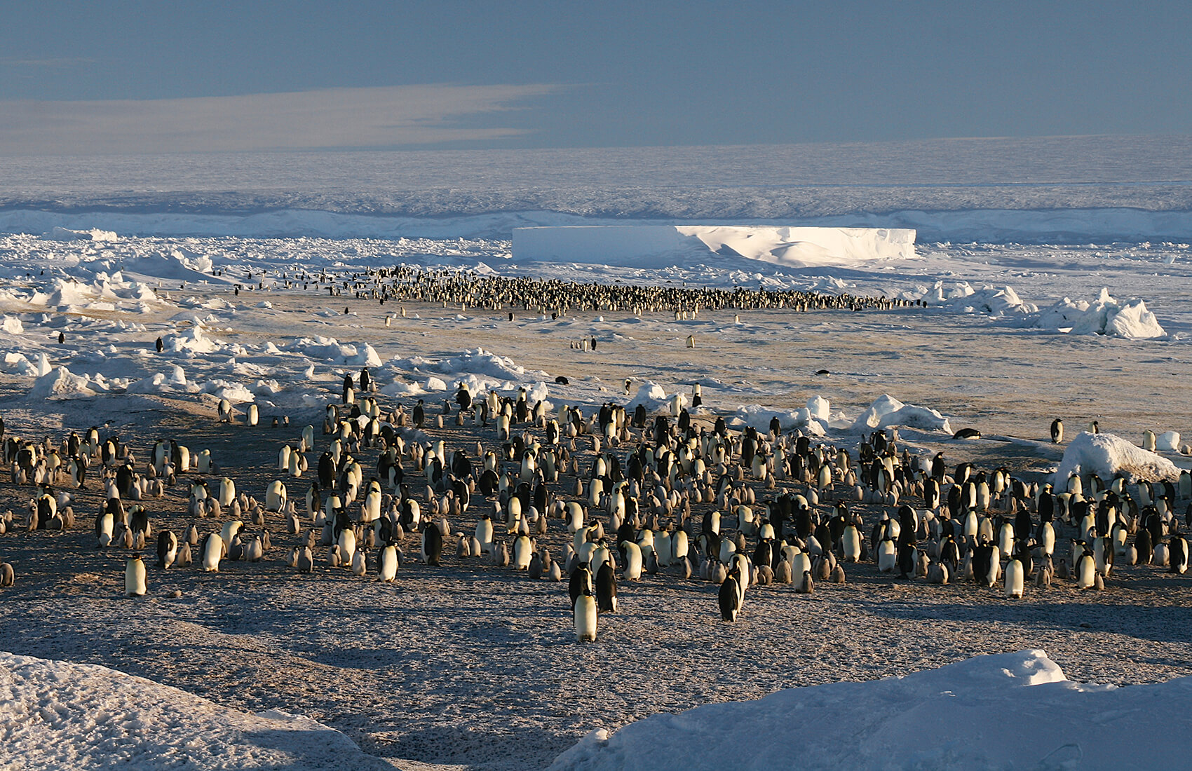Hundreds of emperor penguins gather on a snowy, icy Antarctic landscape with distant icebergs and snowfields under a cloudy sky.