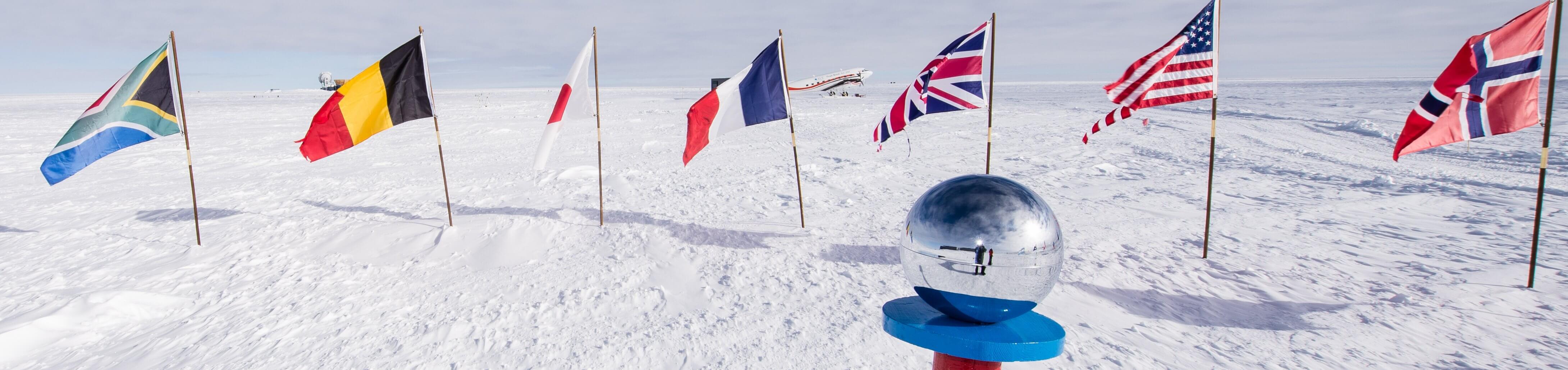 A reflective silver sphere on a blue-and-red stand sits in the snow at the South Pole, surrounded by national flags including the United States, United Kingdom, Norway, and others, with an Antarctic landscape and an airplane from Antarctic Logistics and Expeditions nearby.