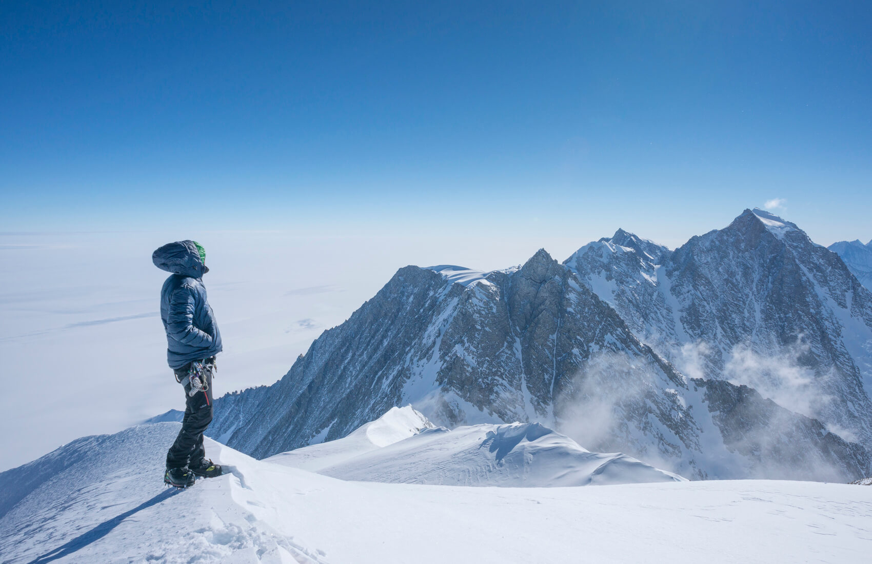 A climber in winter gear stands on a snowy mountain ridge, gazing at distant peaks under a clear blue sky—an adventure made possible by Antarctic Logistics and Expeditions in the heart of Antarctica.