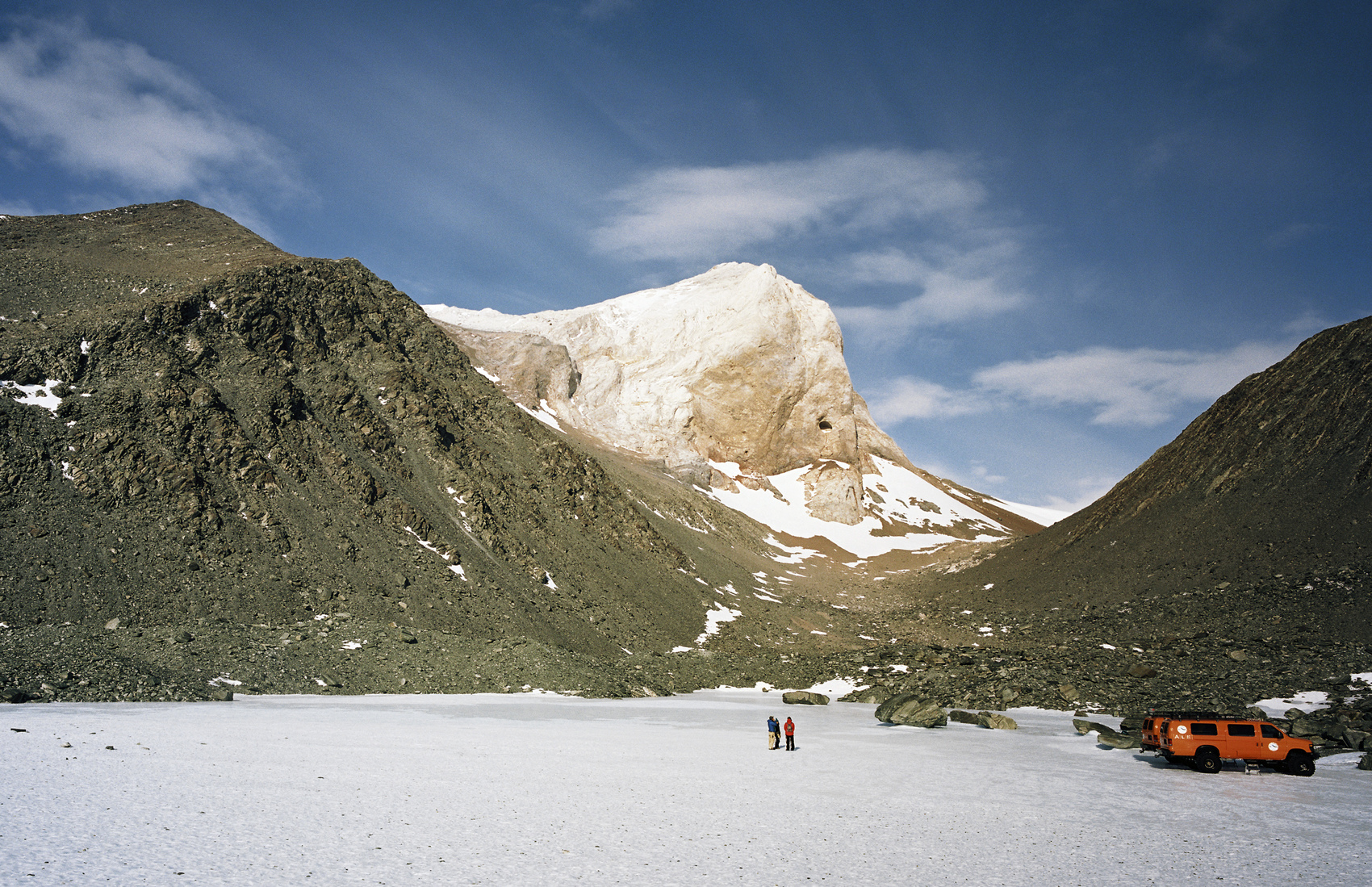 Two people stand on a snow-covered plain near a bright orange Antarctic Logistics and Expeditions vehicle, surrounded by rocky mountains and a tall, snow-capped peak under a blue sky with wispy clouds in Antarctica.