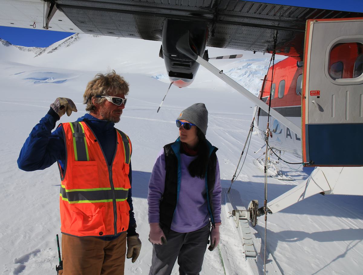 ALE staff talk after a landing at Vinson Base Camp
