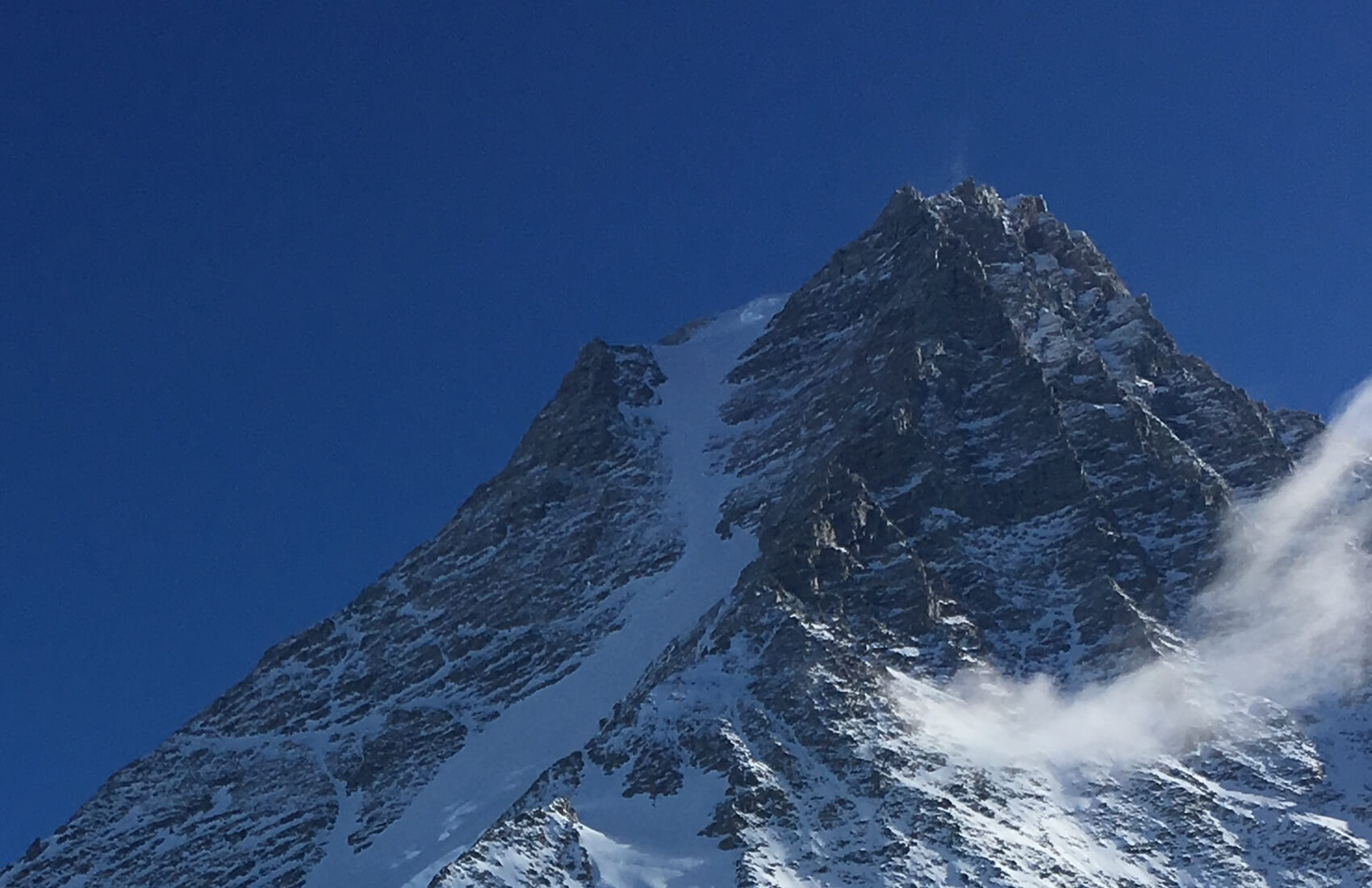 Snow-covered, rocky mountain peak rises sharply against a clear, deep blue sky in Antarctica, with a small cloud drifting at the lower right—an awe-inspiring scene reminiscent of Antarctic Logistics and Expeditions near the South Pole.
