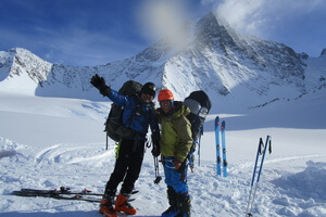 Two climbers in winter gear stand on snowy terrain with skis and poles, smiling and posing in front of a tall, snow-covered mountain under a blue sky during their Antarctic Logistics and Expeditions adventure.