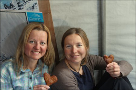 Two women smiling and holding heart-shaped pastries sit indoors near a wall with a map and a sign that says Ellsworth, evoking the spirit of Antarctic Logistics and Expeditions and adventures in Antarctica.