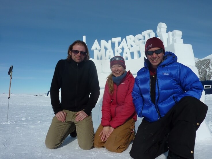 Three people in winter clothing kneel on snow before a large ice sculpture reading Antarctica Marathon. The clear blue sky and snowy mountains highlight the remote South Pole, supported by Antarctic Logistics and Expeditions.