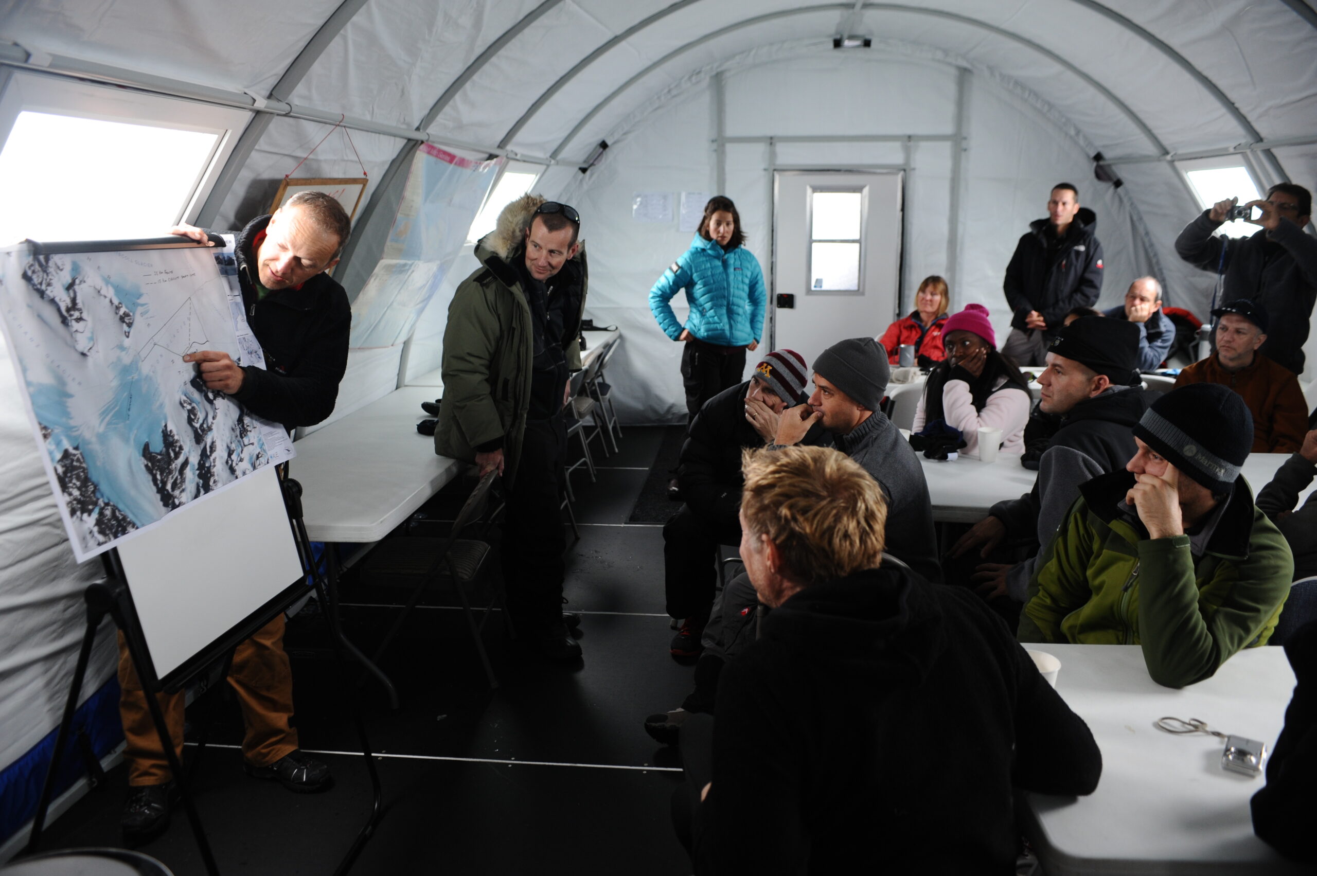 A group of people in winter clothing sit inside a white tent, listening to a person pointing at a large map on an easel at the front of the room. Some people are taking notes, while others watch attentively.