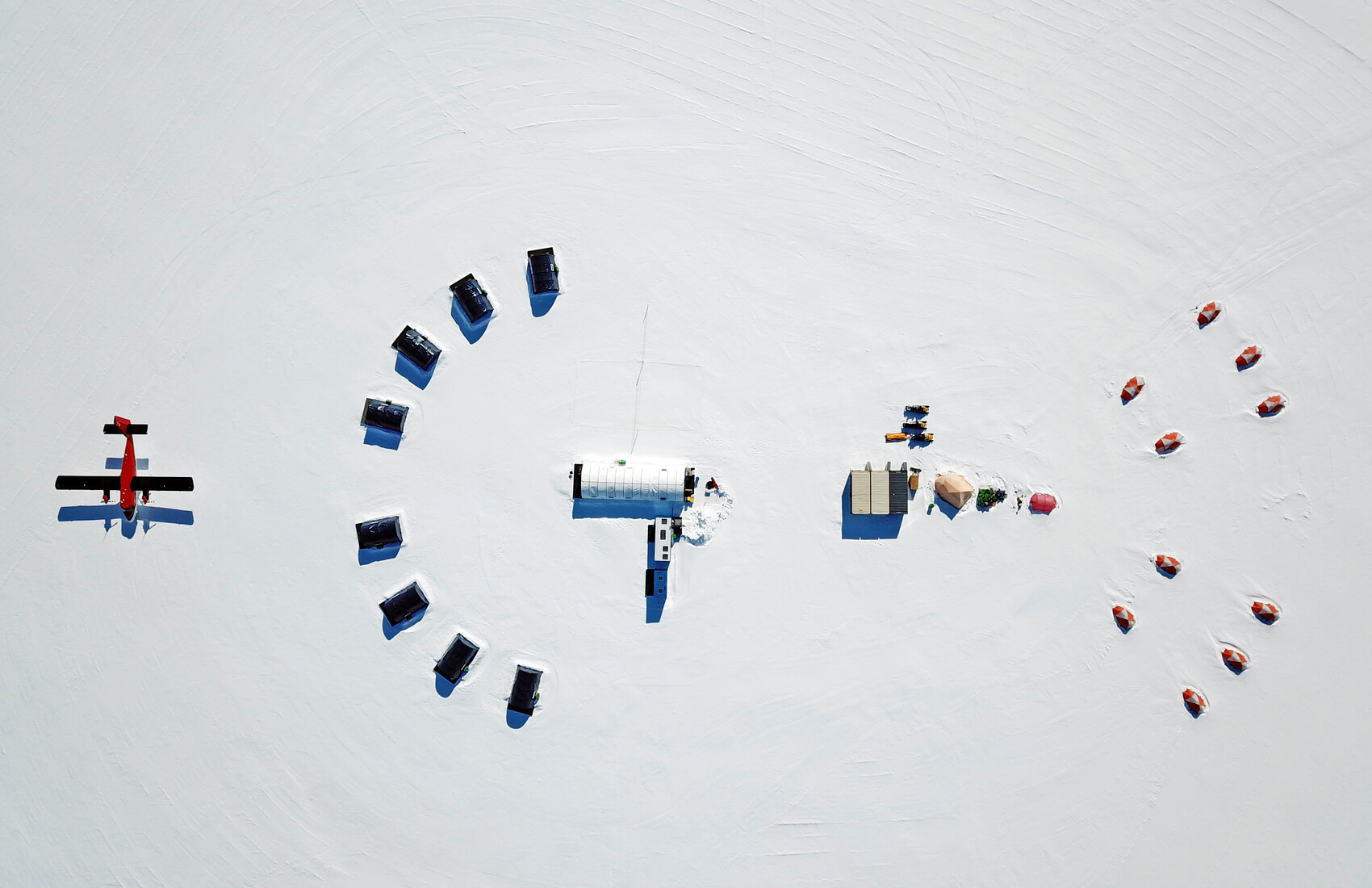 Aerial view of an Antarctic snowy landscape featuring a red plane, several black vehicles in a semicircle, a central white building, and orange tents arranged in a wide arc—capturing the essence of Antarctic Logistics and Expeditions near the South Pole.