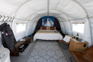 A cozy tent with a large bed, wooden side tables, a coat hanging on the left, two chairs, a patterned rug, and a mountain photo evoke Antarctic Logistics and Expeditions. Wine and glasses sit on one table for the perfect South Pole retreat.