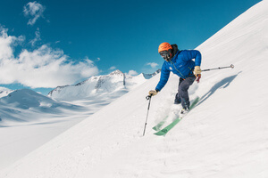 A skier in a blue jacket and orange helmet skis down a snowy mountain slope under a bright blue sky near the South Pole, with snow-covered Antarctic peaks in the background.